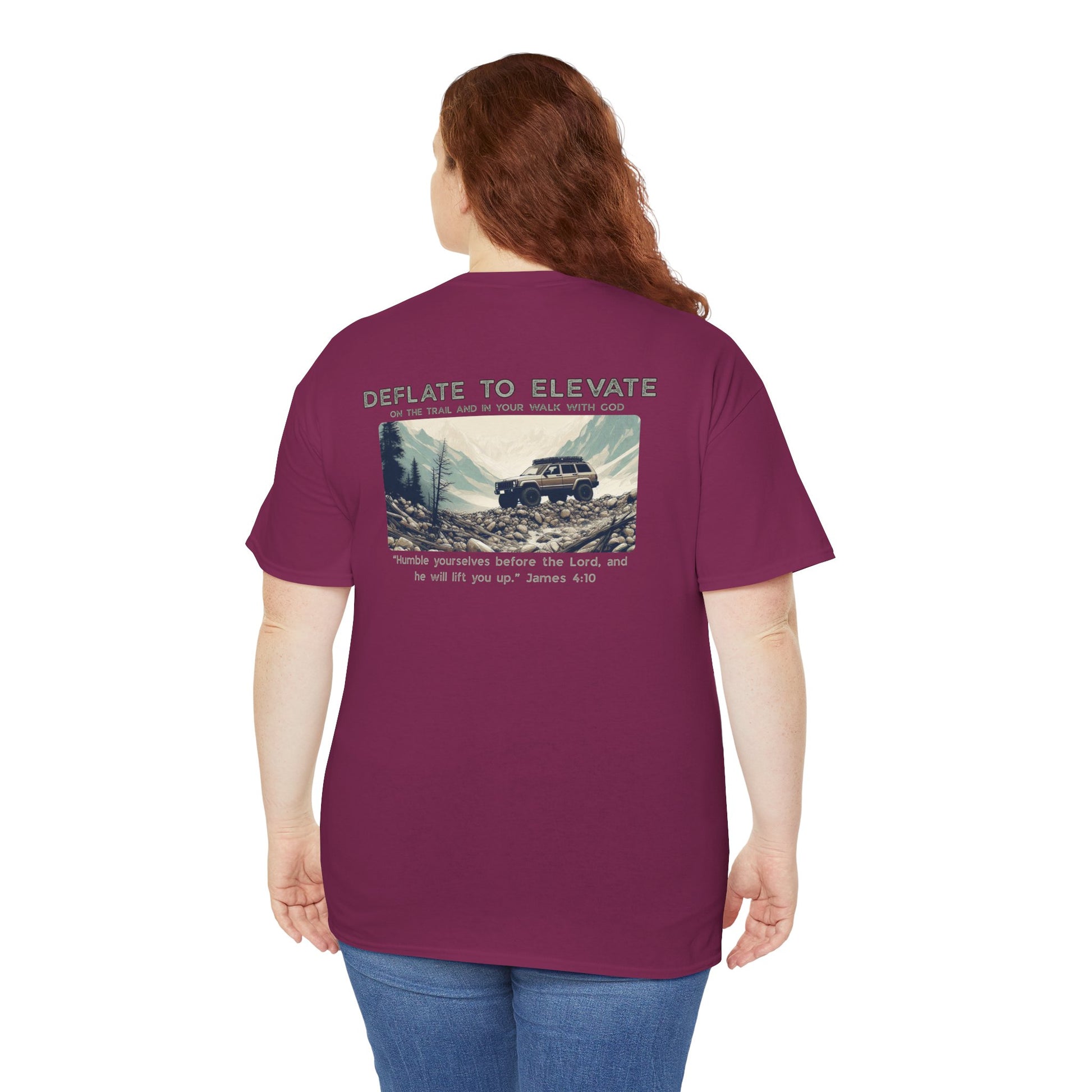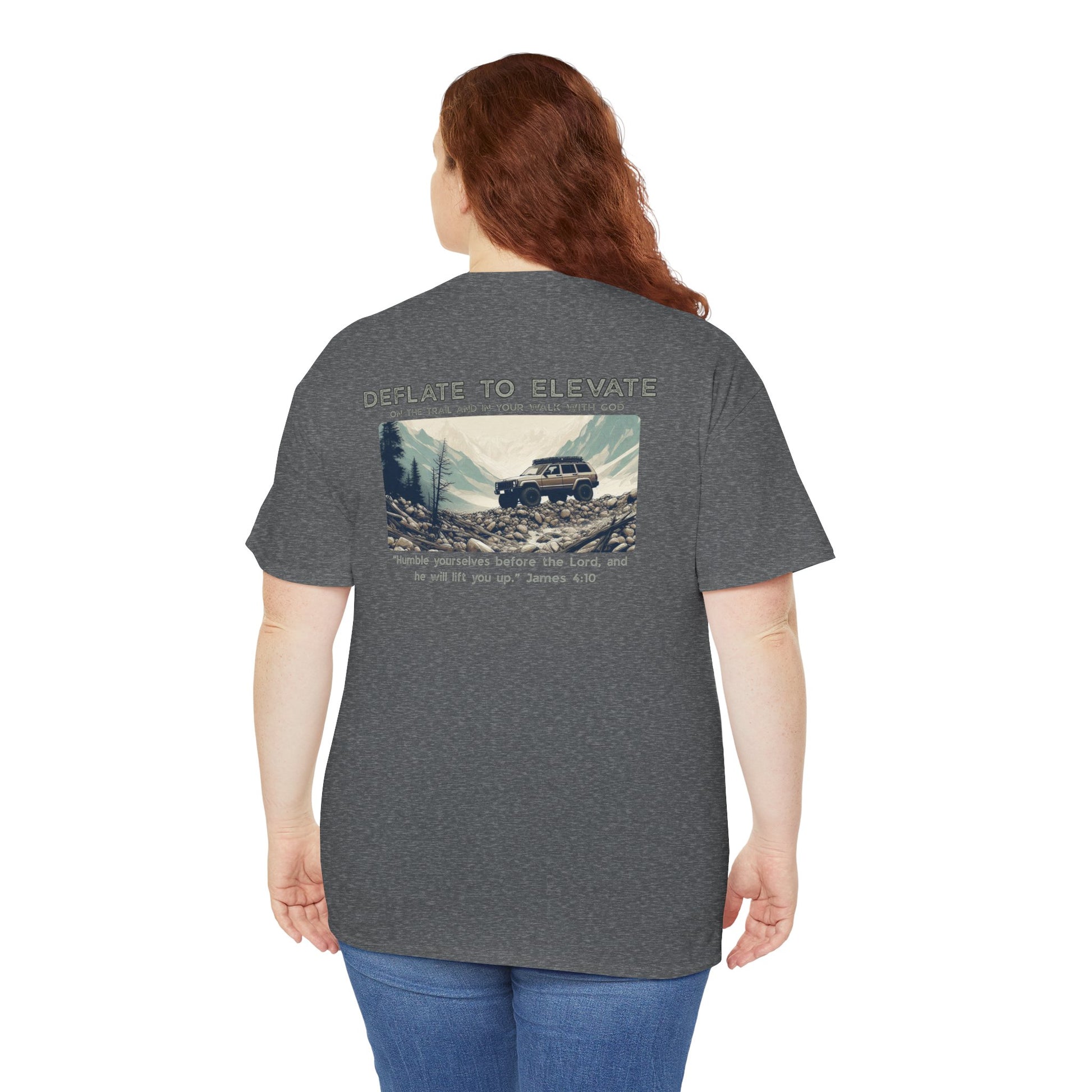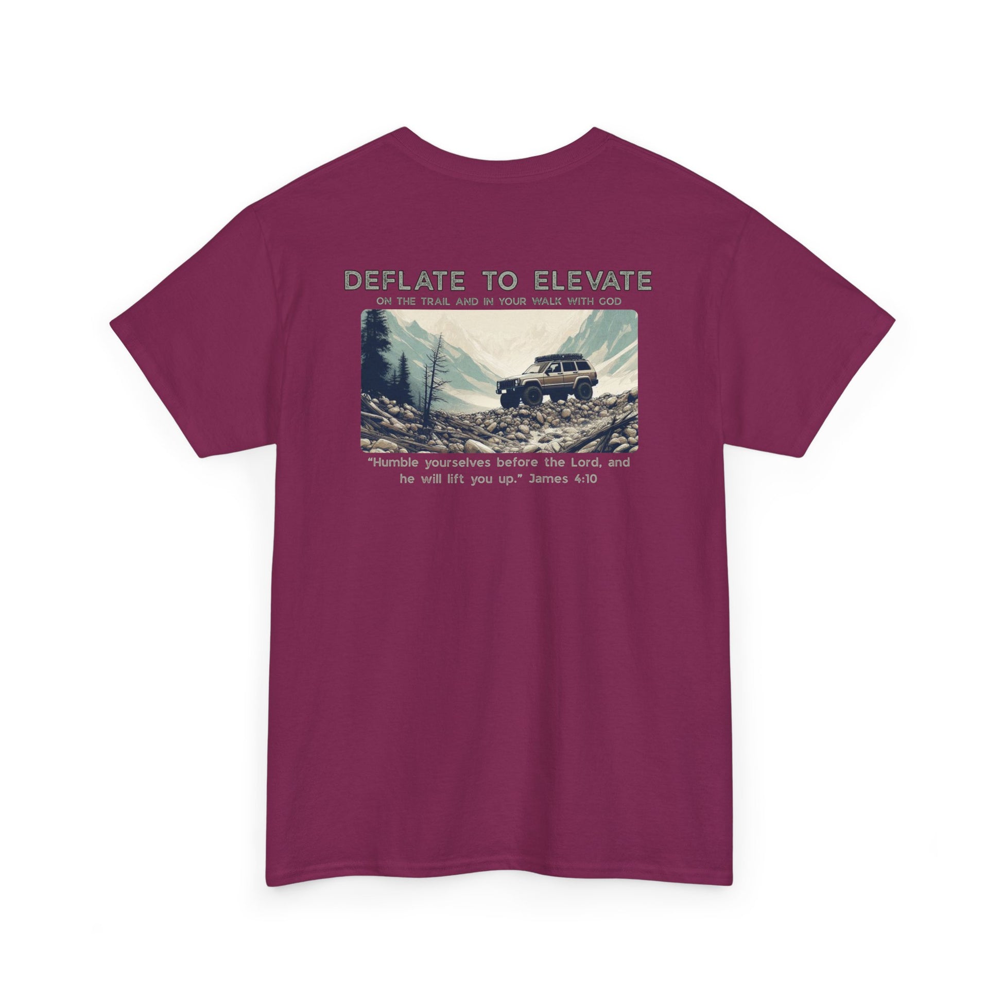 Hit the trails and walk in faith with our Deflate to Elevate t-shirt — a powerful reminder to stay humble before God and trust His lift. Inspired by James 4:10, this design connects off-roading and faith: “Humble yourselves before the Lord, and He will lift you up.”