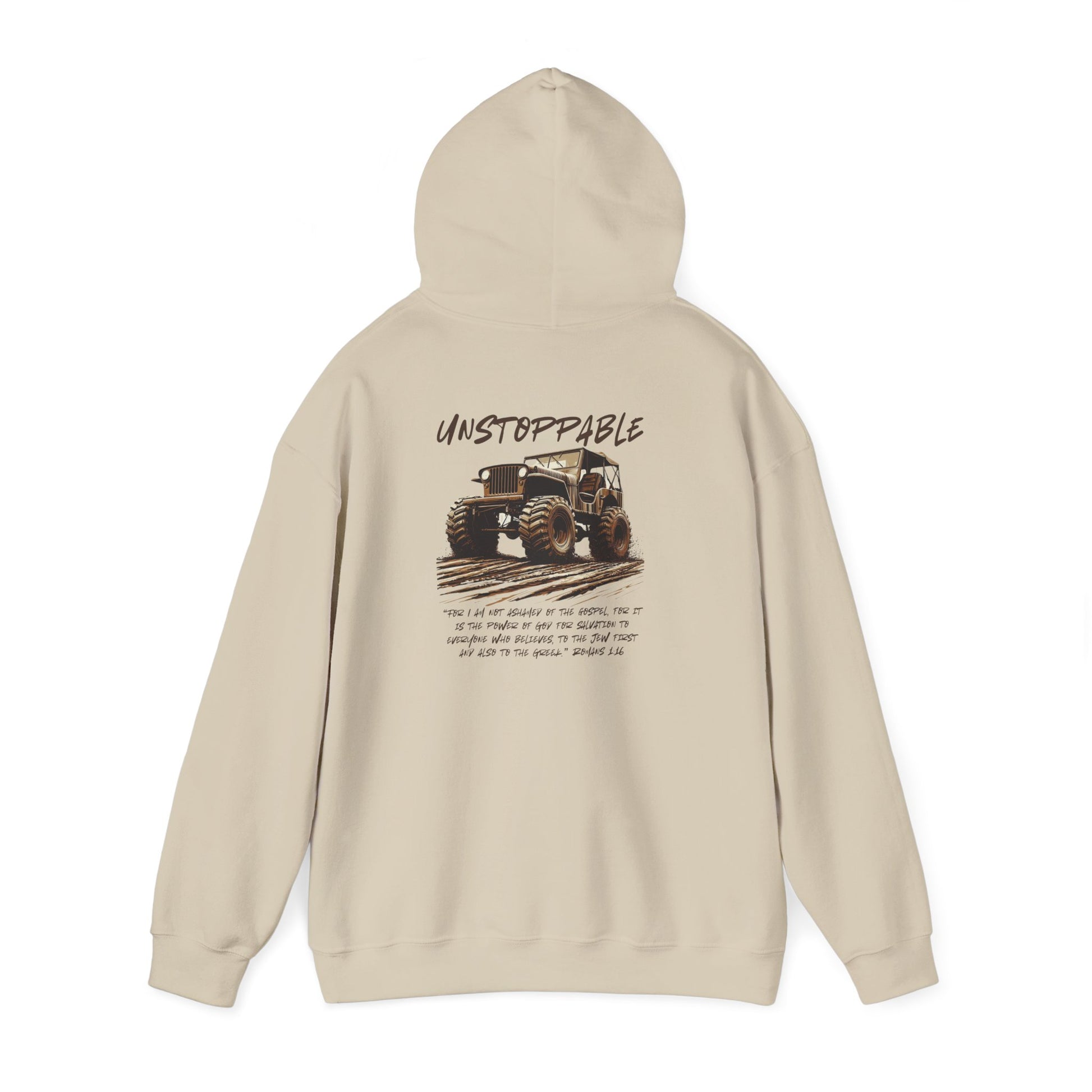 Go bold in your faith and your ride with the Unstoppable Faith hoodie from Armor & Axles. This sandy-colored cotton sweatshirt features our signature Armor & Axles logo on the front and a robust back design with the word "Unstoppable" over a gritty image of a mud-splattered 4x4. Underneath, Romans 1:16 stands firm as a reminder: "For I am not ashamed of the gospel, because it is the power of God that brings salvation to everyone who believes."